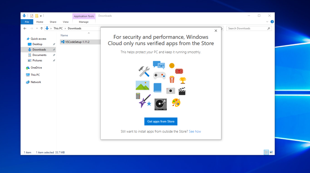 Forsøger du at installere et almindeligt program, vil en advarsel poppe op og fortælle, at programmet ikke kan installeres og i stedet foreslå en app fra Windows Store.