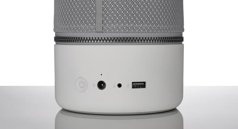 I bunden af højttaleren finder du tænd/sluk-knappen sammen med en dedikeret port til opladning (ingen MicroUSB her), samt en audioport og USB-stik.