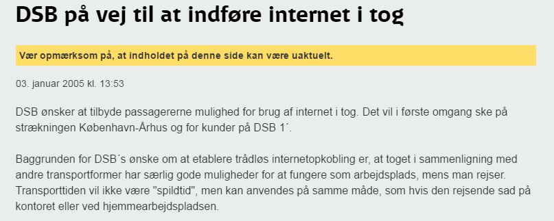 Allerede tilbage i 2005 proklamerede DSB, at man ville indføre trådløst internet for rejsende på første klasse med intention om senere at gøre denne service tilgængelig for alle togets passagerer.