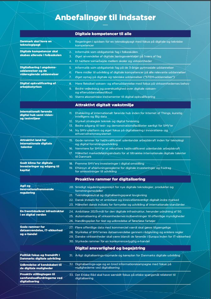 Du finder alle anbefalingerne fra Det Digitale Vækstpanel på Erhversministeriets website: Digitalt Vækstpanel - anbefalinger.