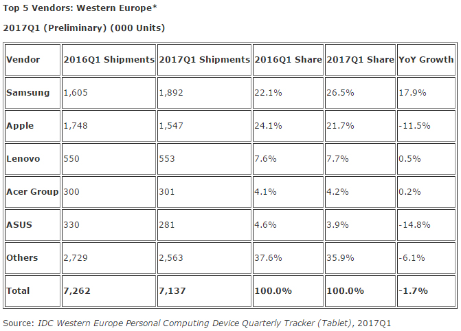 "Samsung voksede og sikrede sig førstepladsen i Vesteuropa takket være en stærk position inden for slates," skriver IDC.