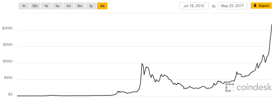 Bitcoins brød 1.000 dollar-mærket tilbage i 2013, men faldt hurtigt derefter på grund af blandt andet et "børskrak" hos den daværende mest benyttede Bitcoinhandel, Mount Gox.