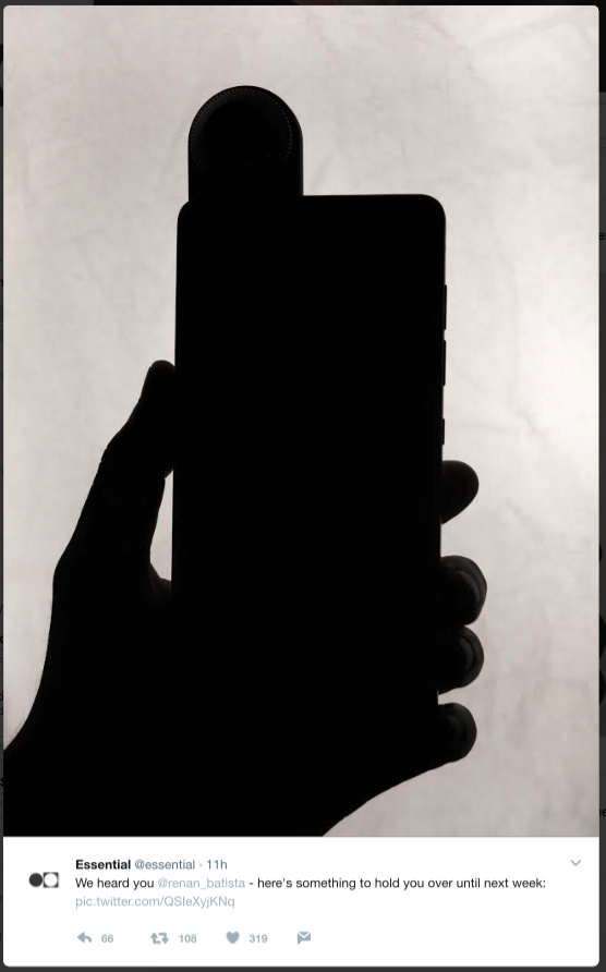I et Twitter-opslag lover Andy Rubin, at der vil være nyt at høre om den 30. marts, og i et efterfølgende tweet deler Essentials egen Twitter-konto et billede af en smartphone-siluet med en ekstra bule for oven.