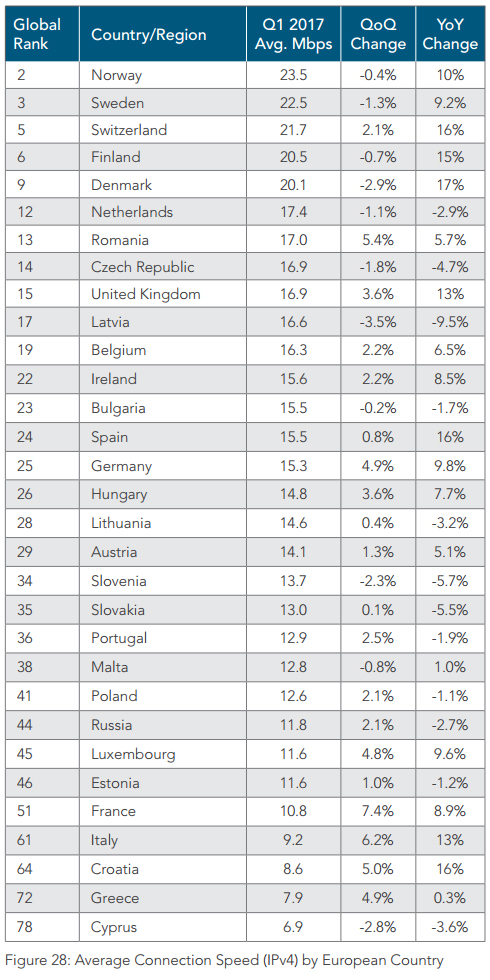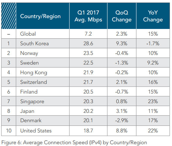 Førstepladsen i Akamais undersøgelse går til Sydkorea, der kan levere en gennemsnitlig internethastighed på 28,6 Mbps.