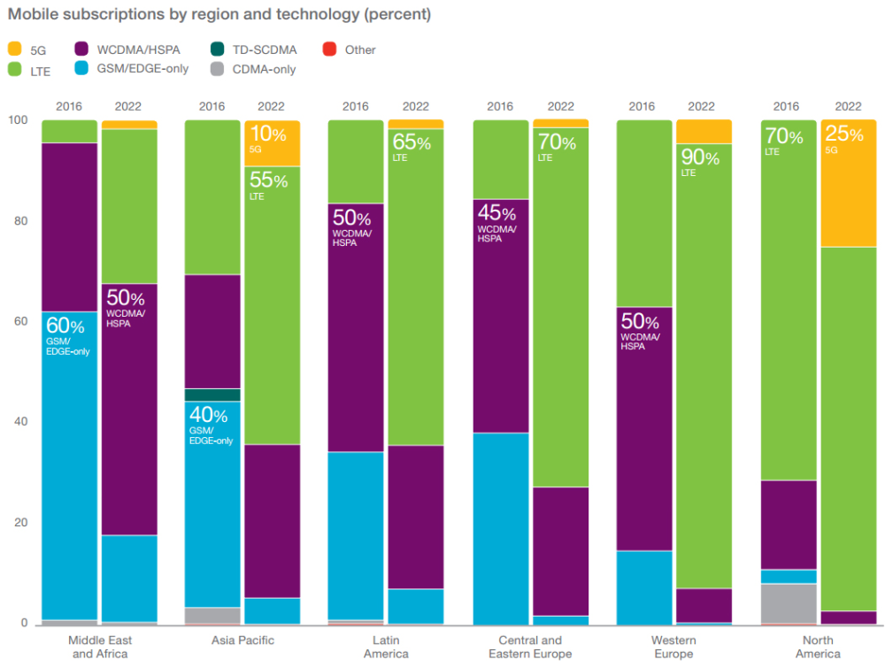 I Nordamerika ventes det, at hele 25 procent af mobilabonnementerne vil køre på 5G-nettet i 2022, og i Asien-Stillehavet vil det være 10 procent, der anvender 5G.