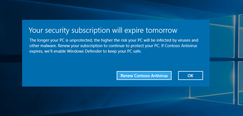 "Microsofts eget, gratis og indbyggede Windows Defender Antivirus kører ikke periodiske scanninger uden eksplicitte handlinger fra kunderne og giver ikke beskyttelse, før den valgte tredjeparts AV-løsning ikke længere beskytter Windows 10-enheden, fordi det er udløbet."