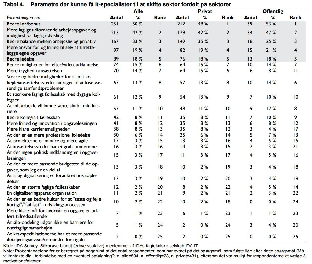 Undersøgelsen, der er udarbejdet blandt IDA's egne medlemmer slår fast, at det ikke er buzzord som agilitet, tværfaglighed eller opgør med silotænkning, der kan få de danske it-specialister til at klappe den bærbare computer sammen og søge fra det private til den offentlige sektor eller den anden vej rundt.