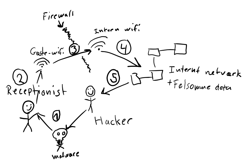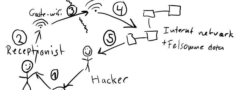 ”Vi var kommet lidt for tidligt, så vi fik lov til at brugte gæste-WiFi i receptionen. Vi scannede netværket og kunne se, at der var en adskillige smartphones tilkoblet – en af dem var receptionistens privattelefon.”