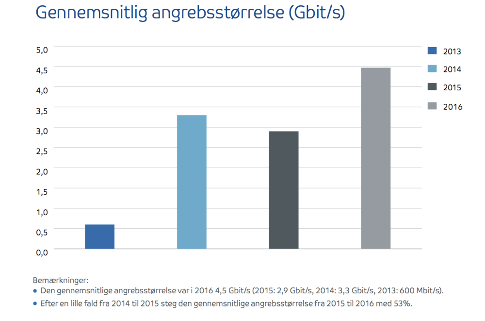 I 2016 var gennemsnitsstørrelsen på et DDoS-angreb 4,5 Gbit i sekundet, og samtidig er de helt store angreb også vokset.