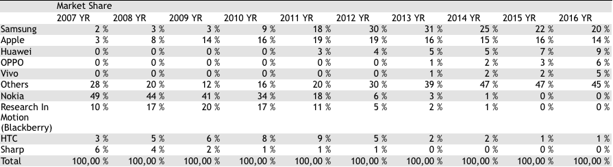 Det har også betydet, at Apples markedsandel er faldet, selv om selskabet sælger iPhones som aldrig før - 216 millioner enheder i 2016.