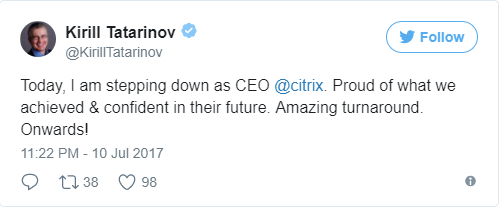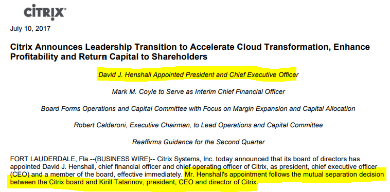 Der er ikke kommet nogen begrundelse for, hvorfor Tatarinov ikke skal fortsætte som øverste leder af Citrix, men bestyrelsen beretter, at Citrix nu kigger mod overgangen til cloud som skal give virksomheden succes.