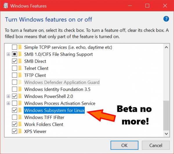 “Early adopters i Windows Insider programmet vil bemærke, at WSL ikke længere er markeret som en beta-funktion med Insider build 16251,” skriver Microsoft.