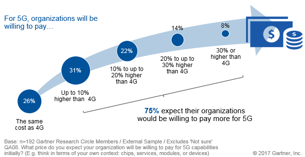 Gartner kan konkludere, at 75 procent af de organisationer, der deltager i undersøgelsen, svarer, at de er villige betale mere for at få adgang til de nye muligheder, der ligger i 5G-teknologien.