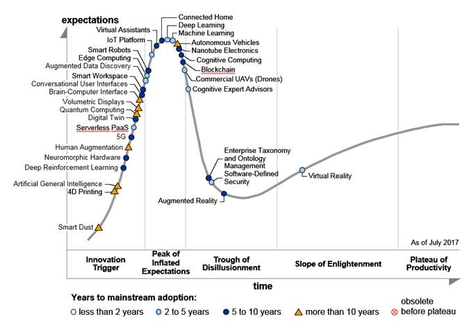 Denne situation er illustreret i Gartners hype cycle for 2017, som vi skrev om for nogle uger siden: