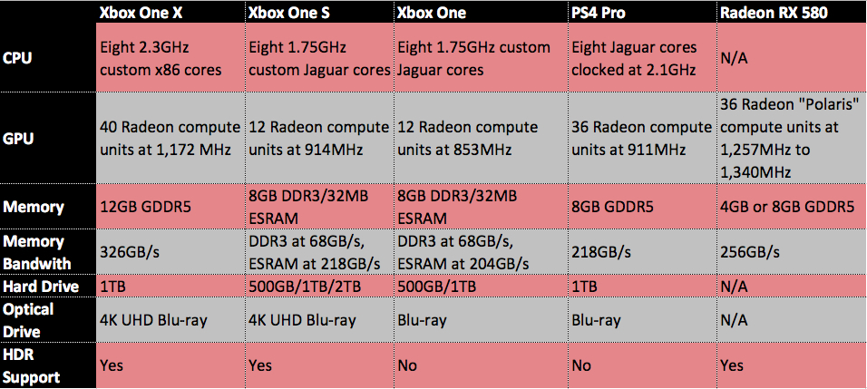 Xbox One X er en voldsom forbedring i forhold til den første Xbox One, og One X er blandt andet udstyret med AMD’s seneste APU, der er udstyret med 40 Radeon-kerner clocked på 1.172MHz.
