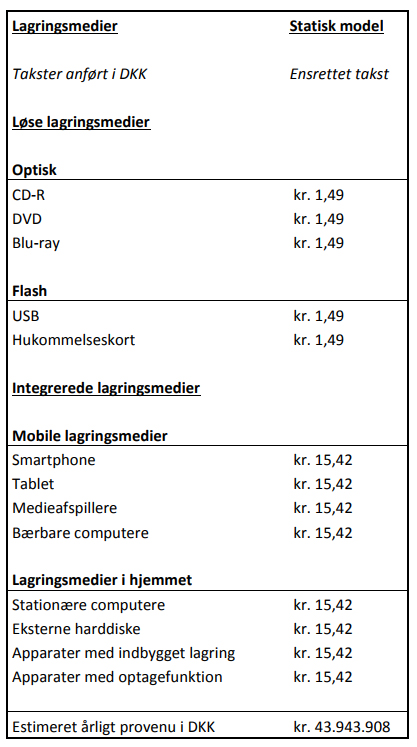 “Det betyder, at løse lagringsmedier fremover skal takseres med DKK 1,49 og integrerede lagringsmedier med DKK 15,42. Dette giver et samlet forventet provenu på knap DKK 44 mio. svarende til DKK 7,60 pr. indbygger.”