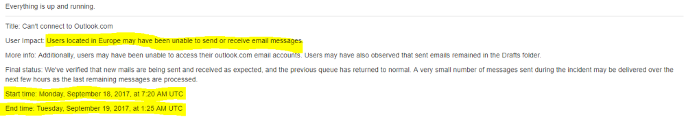 Det meste af dagen kan brugerne i følge Microsoft selv have oplevet problemer med at sende emails, og det var i følge Windows selv først kort tid før midnat, at man kunne konstatere, at problemet var løst.
