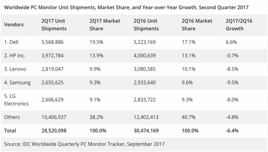 Dell er ifølge IDC verdens største producent af pc-skærme i andet kvartal i år med en markedsandel på 19,5 procent, og det er også Dell, der har mest vækst med en stigning på 6,6 procent i forhold til samme kvartal sidste år.