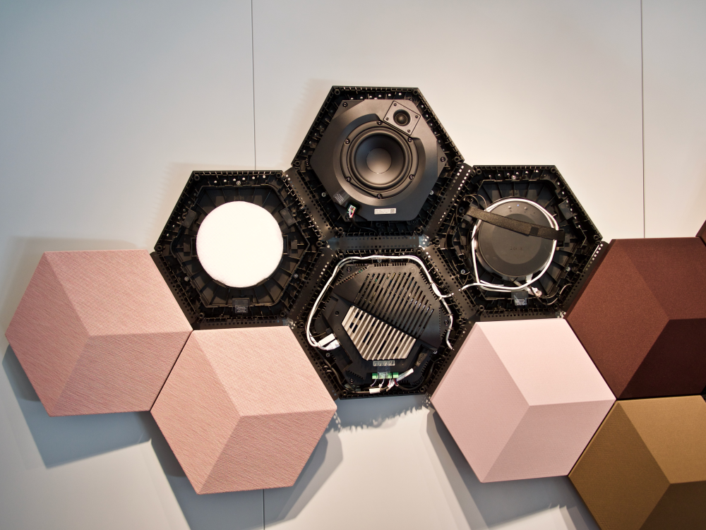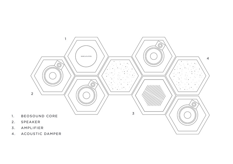 BeoShape er en samling af forskellige højttalermoduler i sekskantede former, der kan samles på et utal af måder og geometriske mønstre.