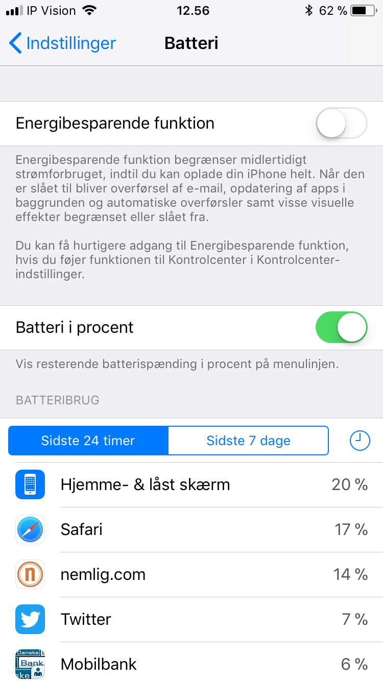 Her har du mulighed for at slå den energisparende funktion til, hvis du er nervøs for, om din iPhones batteri holder dagen ud.