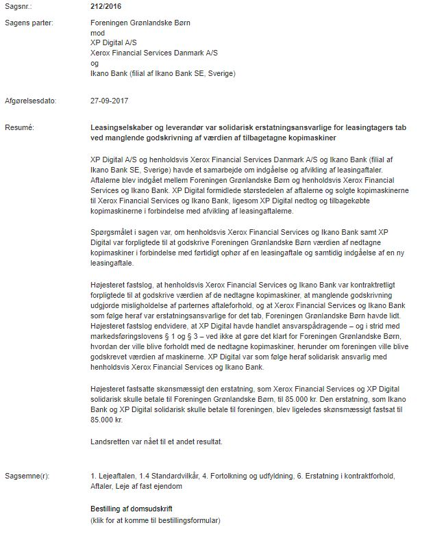 Mailen indeholdt en dom fra Højesteret, der slog fast, at slutbrugeren i en leasingaftale om printudstyr har ret til godtgørelse, hvis udstyret pilles ned som led i en ny aftale.