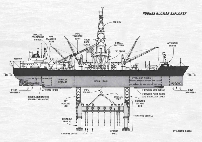 Undervejs rekrutterede CIA den mystiske milliardær Howard Hughes, bildte hele verden ind, at undervandsminer var fremtiden, og skabte flere falske selskaber, hvis medarbejdere deltog på videnskabelige kongresser i årevis.