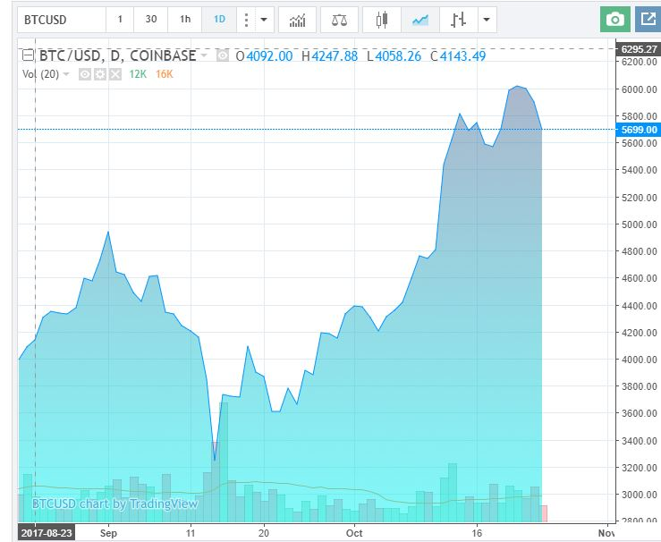 Kursen er da den seneste tid også banket i vejret. For få dage siden rundede kursen 6000 dollar, hvilket er tilnærmelsesvis en fordobling siden midten af september, hvor kursen tog et voldsomt dyk efter de kinesiske og sydkoreanske myndigheder forbød ICO-investeringer. Begrundelsen var, at det er en oplagt metode til hvidvask af penge, fordi de digitale valutaer er anonyme og stort set uregulerede.