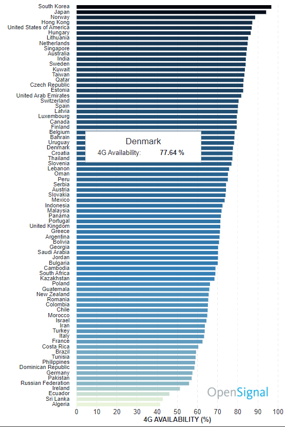 Foran Danmark ligger også lande som Ungarn, Litauen, Tjekkiet og Letland, mens der naturligvis også er rigtig langt op til førstepladsen, hvor Sydkorea kan klare en 4G-tilgængelighed på hele 96,69 procent.