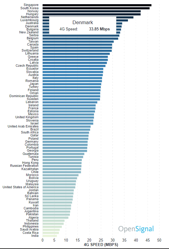 Også her er der dog ganske langt op til førstepladsen, for i Singapore får man en gennemsnitlig 4G-hastighed på 46,64 Mbps.