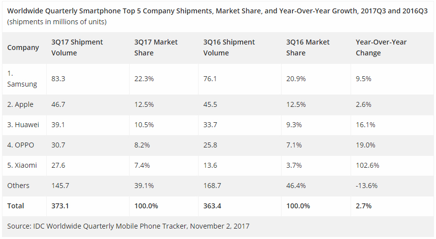Ifølge analysefirmaet IDC sendte smartphone-producenterne i tredje kvartal i år 2,7 procent flere smartphones afsted fra fabrikkerne i forhold til samme kvartal sidste år.