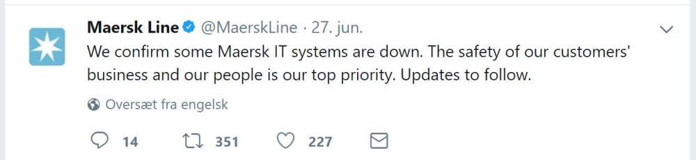 "Jeg holdt øje med Mærsk, da angrebet ramte. Virksomheden skrev på deres sociale mediekonti en kort besked med det samme - Vi har nogle problemer med vores it-systemer. Vi rapporterer nærmere om situationen hurtigst muligt," siger Hypponen og fortsætter:
