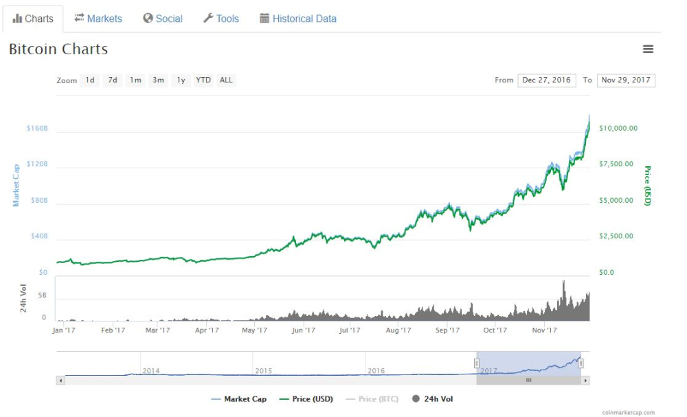 Dermed krydser den omdiskuterede Bitcoin endnu en grænse på den rejse, der siden årets begyndelse har tidoblet kursen fra omtrendt 1000 dollar til nu 10.000 dollar.