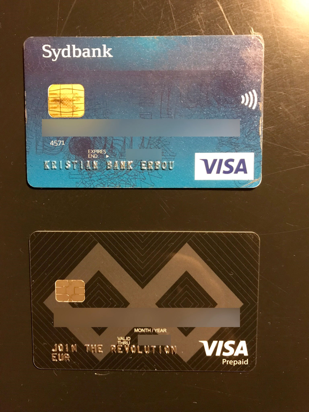 Kortet øverst er min billet til som kunde i en dansk bank at betale med danske kroner, der er udstedt og garanteret af den danske stat gennem lovgivning vedtaget af Folketinget.