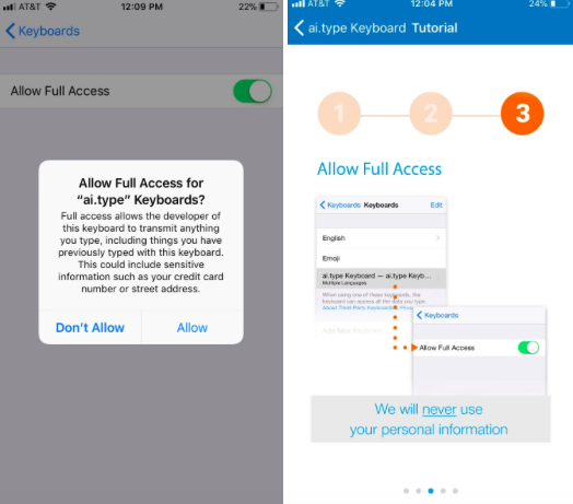 Da forskerne installedere Ai.Type blev de chokerede over at opdage, at brugerne skal give 'fuld adgang' til blandt andet data fra telefonen og deres tastatur-data.