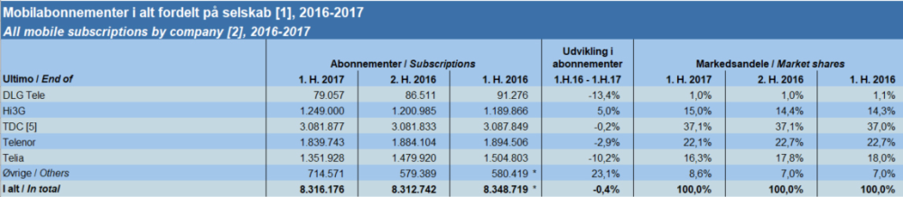 Ifølge Energistyrelsens Excel-ark havde TDC ved udgangen af første halvår 2017 3.081.877 mobilabonnementer i Danmark, hvilket er samme niveau som i første halvår 2016.