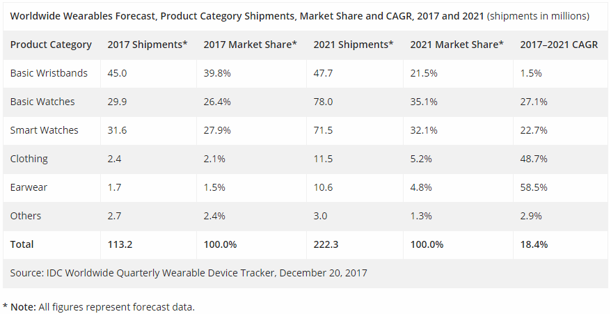 “Ure (både smart og basic) har kurs imod at overtage føringen og ventes at stige fra 61,5 millioner i 2017 til 149,5 millioner i 2021 i takt med, at der kommer flere flere leverandører - særligt modebrands - hvilket driver væksten i denne kategori,” skriver IDC.