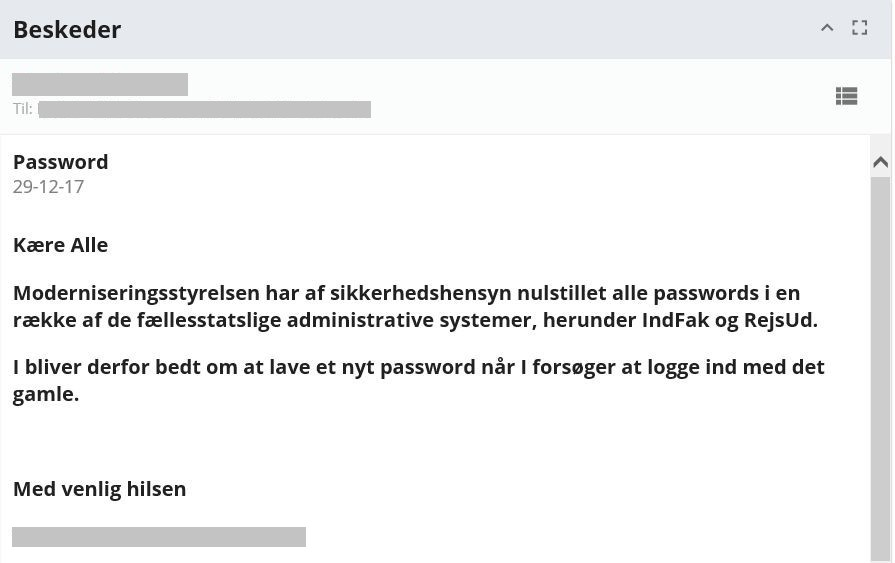 "Omkring den 27/12 udsendte Moderniseringsstyrelsen mails til en række brugergrupper med beskeden om, at adgangskoderne i en række systemer var nulstillet. Dengang undrede jeg mig over, at beskeden var lidt upræcis om hvilke systemer, der var omfattet. Og jeg skriver ‘mails,’ fordi de så ud til at være udsendt kumulativt til hele brugergrupper," skriver kilden til Computerworld.