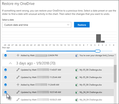 For at genoprette filerne trækker du en knap langs tidslinjen og vælger den ønskede dato.
