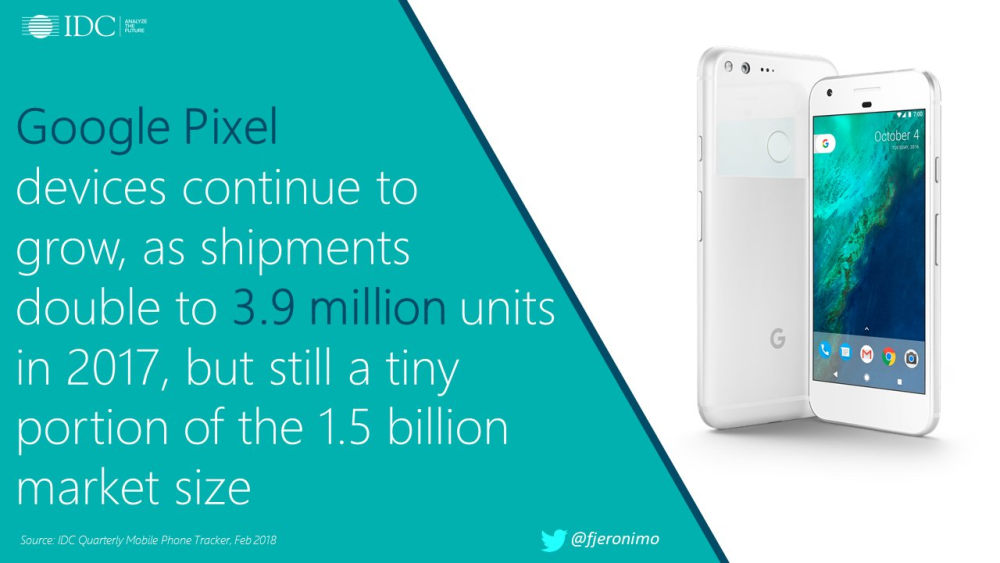Ifølge IDC solgte Google i hele 2017 knap 3,9 millioner Pixel-telefoner, Pixel, Pixel XL, Pixel 2 og Pixel 2 XL, hvilket er forsvindende lidt i havet af 1,5 milliarder solgte smartphones på globalt plan.