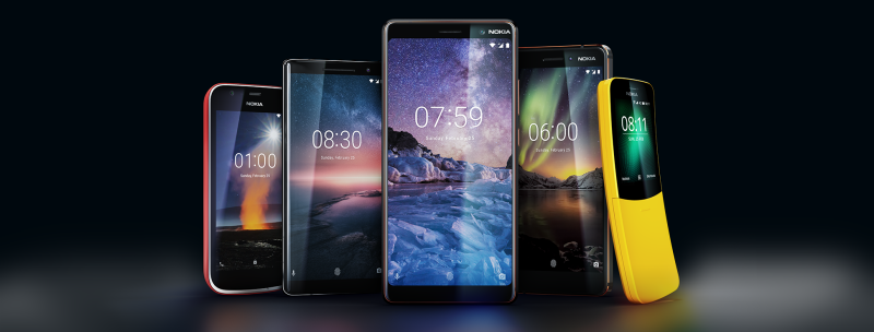 De er Nokia 8 Sirocco, Nokia 7 Plus, Nokia 6 samt Nokia 1. Og altså Nokia 8110 ‘slider’-telefonen i en remake.
