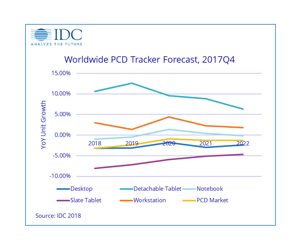 De eneste lyspunkter er tablets med tastatur og notebooks, som der blev solgt henholdsvis 16 procent og otte procent flere af i 2017 i forhold til 2016.
