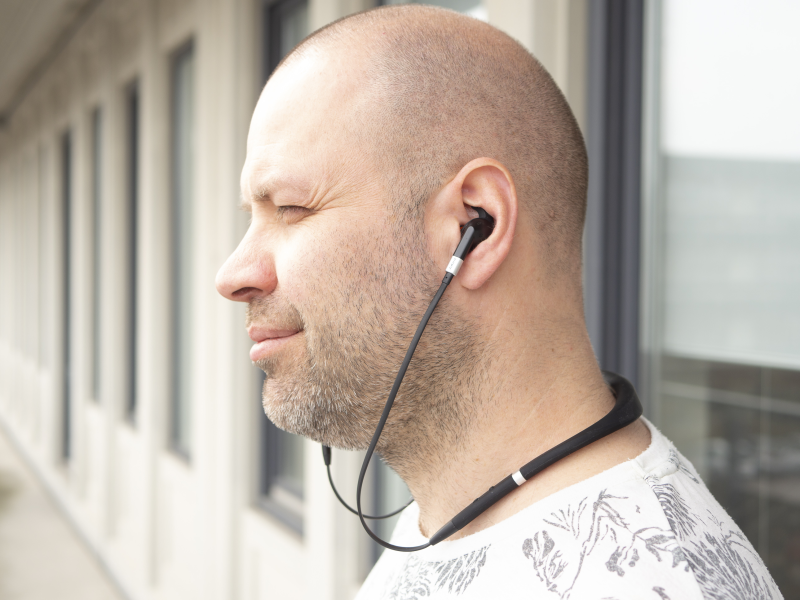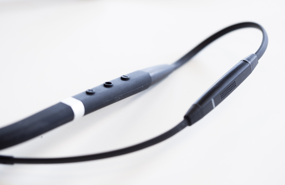 Evolve 75e er ikke helt ledningsfri. Den er snarere en elektronisk halskæde, som smyger sig om nakken på en.