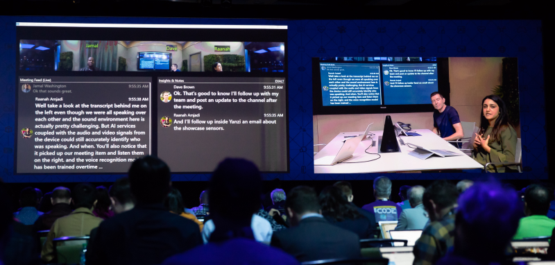 I en live demo på scenen på Build-konferencen viste Microsoft-medarbejdere blandt andet, hvordan et 360 graders kamera og en højttaler med den digitale assistent Cortana indbygget først identificerede hver mødedeltager ud fra deres udseende og stemmer - og derefter helt automatisk tog referat af mødet.