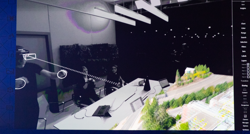 Undervejs i demoen af fremtidens møder viste Microsoft desuden, hvor det alsidige HoloLens-headset kan bruge til at manipulere en 3D-plan af en bygning, mens de øvrige mødedeltagere kunne følge arbejdet på storskærmen, som selvfølgelig var Microsofts egen interaktive Surface Hub-skærm.