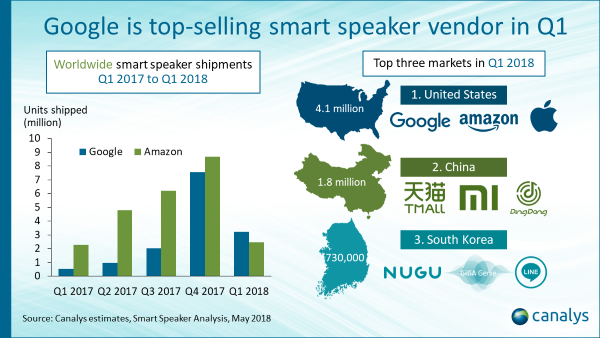 I første kvartal 2018 blev der for første gang nogensinde sendt flere Google-enheder i handlen end Amazon ditto. I alt 3,2 millioner Google Home-enheder mod 2,5 millioner fra Amazons Echo.