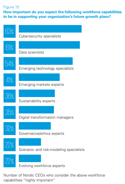 KPMG skriver i rapporten, at de tungere teknologiske kompetencer synes at være prioriteret højere blandt nordiske CEO'er sammenlignet med globale tal, som KPMG også har udarbejdet.