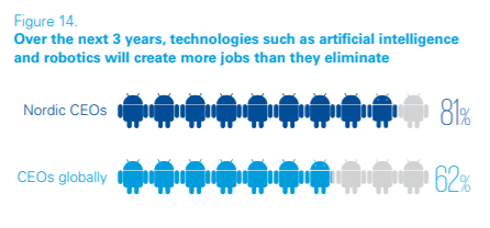 81 procent af de nordiske direktører forventer, at teknologier som AI og robotics vil skabe flere arbejdspladser, end de er med til at nedlægge over de næste tre år. I den samlede globale undersøgelse er det tal nede på 62 procent.