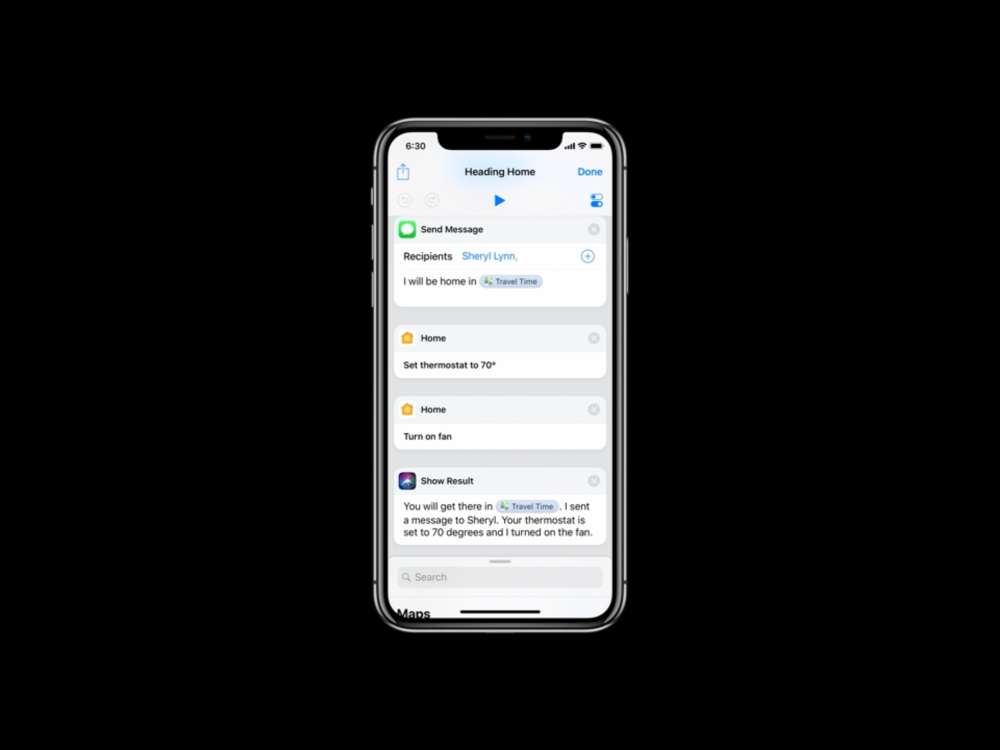 Shortcuts kan endda sammensættes til en spilleliste, så en stribe aktions aktiveres med en enkel stemmekomando. Køreturen hjem fra kontoret kan således automatiseres til at skrue termostaten op derhjemme, finde den hurtigste rute hjem og sætte favorit-playlisten på i bilen.