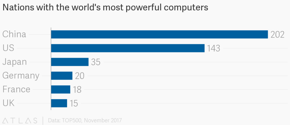 På listen figurerer i alt 202 kinesiske maskiner mod 143, 35, 20 og 18 supercomputere fra henholdsvis USA, Japan, Tyskland og Frankrig. Danmark har ikke en eneste maskine på den liste.