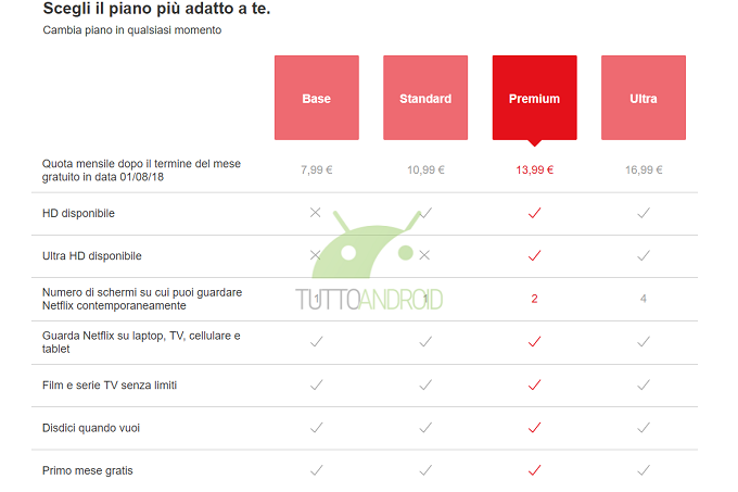 Selskabet opererer i forvejen med tre niveauer i Italien: Basis, Standard og Premium. De populære streaming-pakker Standard (HD kvalitet) og Premium (4K kvalitet) bliver også stækket med Netflix forsøgsløsninger. I stedet for at kunne streame på henholdsvis to og fire enheder samtidigt, bliver antallet af brugere halveret.